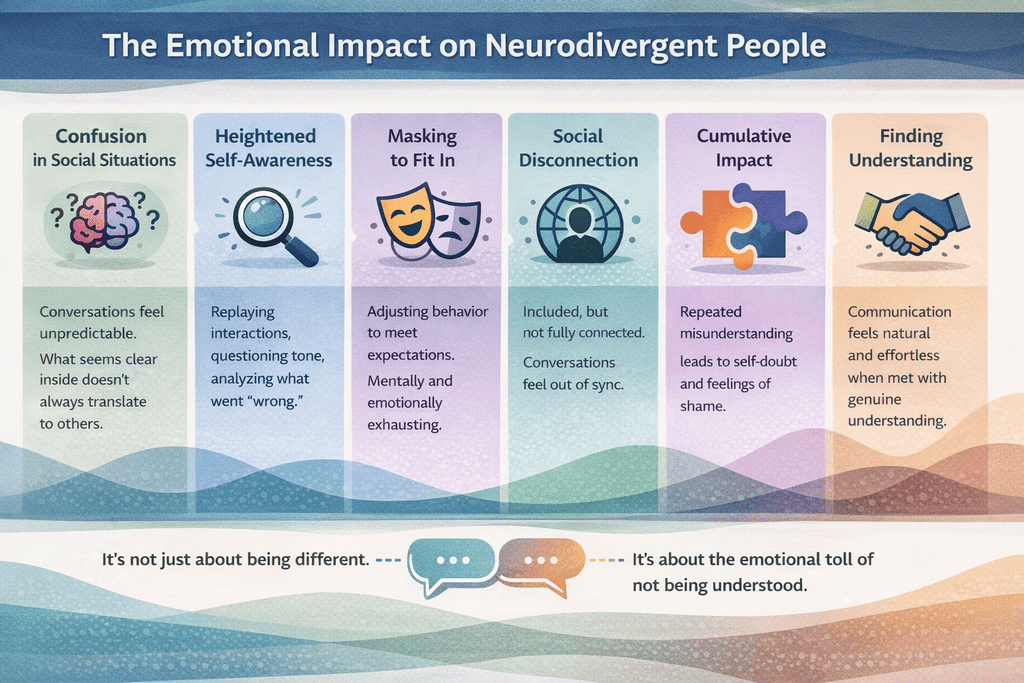 Overall, real-world accounts point to a shared emotional pattern: ongoing effort, frequent misunderstanding, and the impact of navigating environments that are not designed with neurodivergent communication in mind.