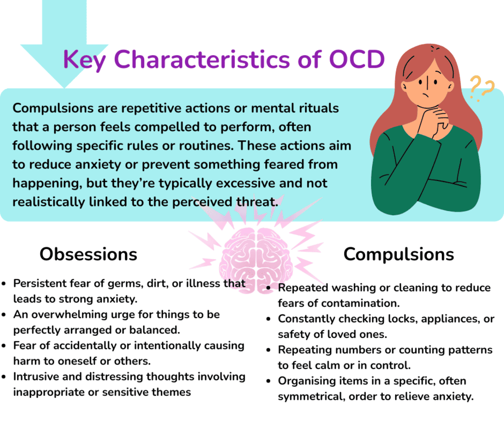 Common obsessions might involve worries about contamination, a strong need for order or symmetry, or intrusive thoughts about harm, while compulsions often include behaviours such as checking, cleaning, or arranging things repeatedly.