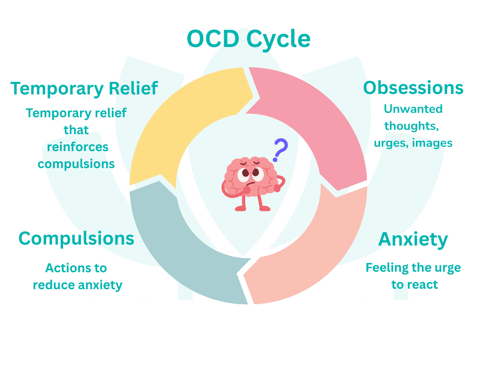 - Cycle: The relief brought by compulsive behaviour is usually short-lived. Soon after, the obsessive thoughts return, triggering anxiety again and continuing a difficult cycle of obsessions and compulsions.